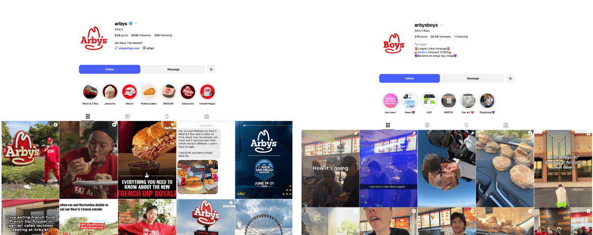 A Arby’s, rede americana de fast food, tem cerca de 400 mil seguidores no perfil principal, e criou outra conta menor nessa linha para gerar mais views.